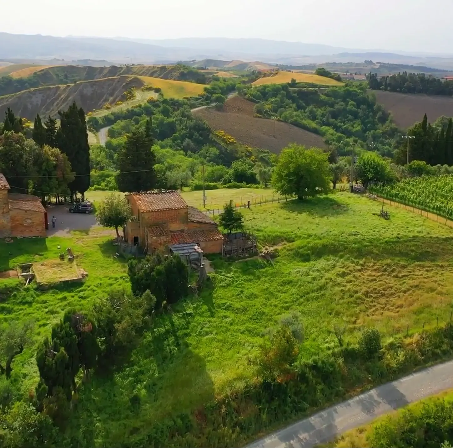 Aerial footage of Tuscany unfolds, the camera gracefully zooming in over rolling hills, vineyards, and charming rustic villas bathed in golden sunlight.